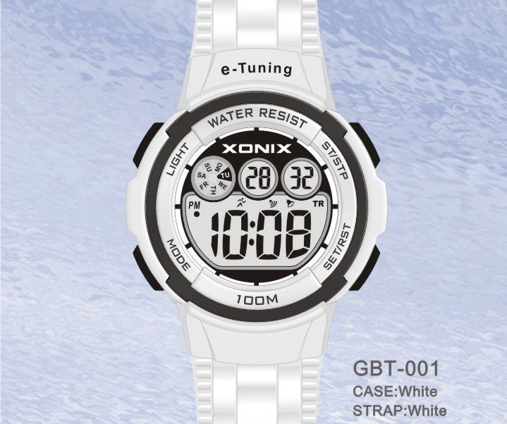 Luz do EL, hora, minuto, segundo, data, dia da semana, carrilhão, cronógrafo, alarme, um formato de AM/PM ou de 12/24 de hora, tempo duplo, temporizador da contagem regressiva, auto do tempo que calibram através do telefone móvel ou computador |