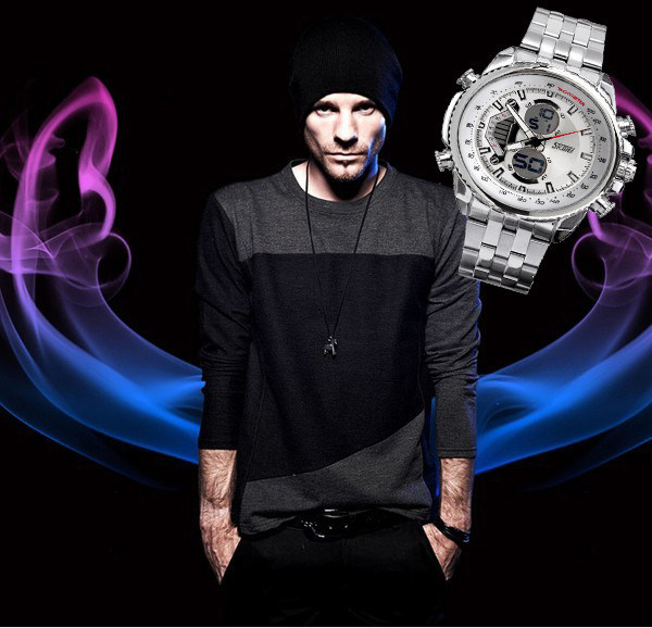 Material principal: ligue o caso, a faixa de aço inoxidável, o mov't digital e o mov't de quartzo, baterias japonesas